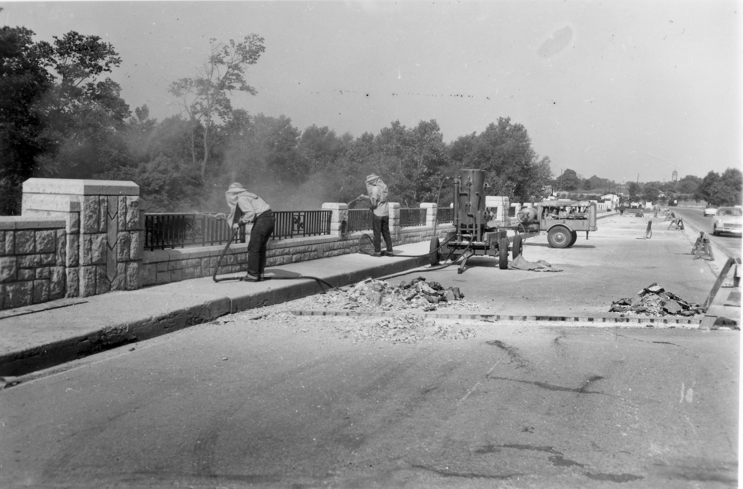 These photos, from the Franklin County Engineers Office, show the construction of the North Broadway Bridge in 1939. Construction began on March 16, 1939, but was hampered by flood waters on May 23rd. Two shifts of men were used for a period of four of the 8-1/2 months the bridge was under construction, to bring the project to completion on time. The stone facing of the bridge is natural Columbus limestone in various colors.